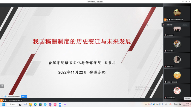 20221122日晚7点,语言文化与传媒学院举办了一场主题为“我国稿酬制度的历史变迁与未来发展”的学术讲座。讲座在腾讯会议线上进行,由语言文化与传媒学院青年教师王书川主讲,22级新闻学、22级网络与新媒体两个专业共146名学生参加。