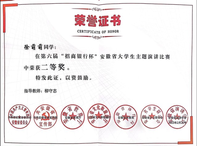 近日,第六届“招商银行杯”安徽省大学生主题演讲决赛在我校举行,语言文化与传媒学院徐萌萌同学经过激烈角逐,荣获本科组二等奖,学院老师柳守志获优秀指导老师称号。