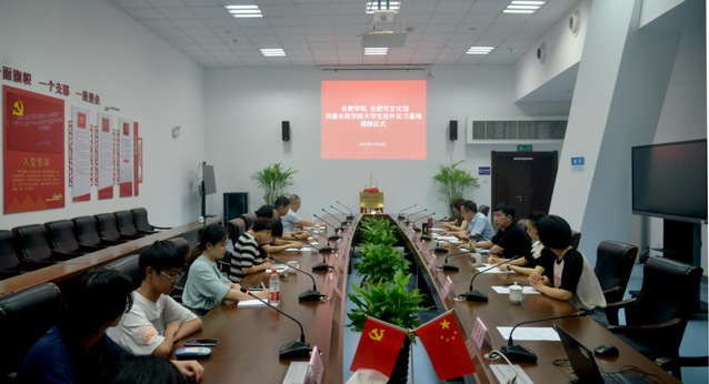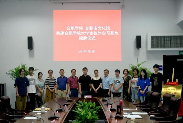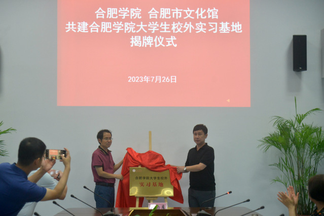 2023年7月26日,合肥学院语言文化与传媒学院同合肥市文化馆签订大学生校外实习基地协议,并举行揭牌仪式。合肥文化馆馆长杨晨、副馆长沈瑭、卫博森、艺术培训部主任吴娴、办公室主任朱淑雅、调研编辑部主任杨治国,语言文化与传媒学院院长丁增武、副院长殷明明、中文系主任洪婧、教学办主任章衡等出席了此次仪式,21级汉语言文学专业学生苏鹏飞、常倩宁、甘为可、季鹏飞、谢传庆作为本年度认知实习学生代表参与仪式并发言。