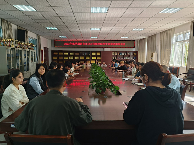 2023年10月18日,语言文化与传媒学院于5栋教学楼二楼会议室召开了新学期学生思想动态座谈会。我院党委副书记张爱萍、副院长殷明明、教学办主任章衡、学工办主任顾盼盼、院分团委副书记刘政、辅导员柳守志和各班级学生代表参加了本次会议。