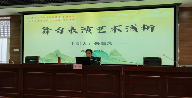 10月16日上午,语言文化与传媒学院“汉语言文学一流专业建设系列讲座”拉开帷幕。首场讲座题为“舞台表演艺术浅析”,特邀讲座人是国家一级演员,文化部优秀专家、安徽省话剧院原院长朱海燕。语言文化与传媒学院副院长殷明明,中文系师生100余人聆听讲座。