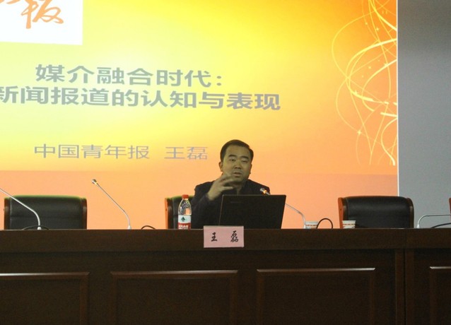 11月30日下午两点半,语言文化与传媒学院顺利举办“善思讲坛”中青年学术讲座,邀请《中国青年报》安徽记者站站长王磊开展题为“媒介融合语境下新闻报道的认知与表现”的主题讲座。语言文化与传媒学院院长丁增武,副院长殷明明、副院长查金萍、新闻与数字传媒系主任张冰清、实验实训中心主任唐元等以及文传学院在校本、硕学生一百余人参加了此次讲座。
