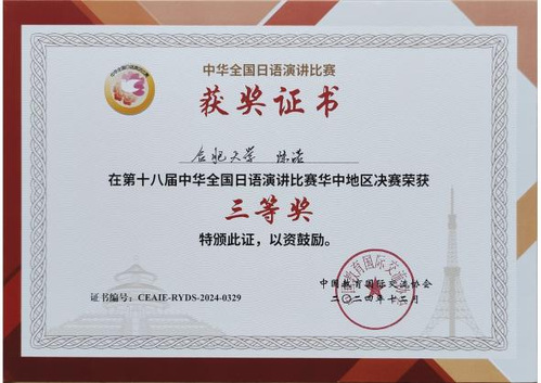 2024年12月28日第十八届中华全国日语演讲比赛华中赛区决赛于华中师范大学举行。我院日语专业陈诺同学取得第九名的成绩,荣获三等奖。