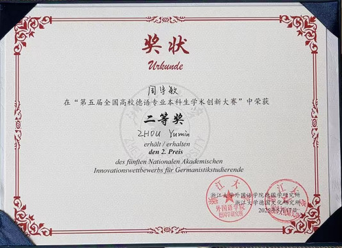 此次参赛作品在朱越老师的悉心指导下,充分融合功能翻译理论与跨文化传播视角,聚焦国家“新质生产力”“一带一路”倡议背景下中国农产品的国际化传播问题,深入剖析了龙井茶、枸杞、普洱茶等典型农产品的德译路径与策略调整,具有鲜明的问题导向、理论深度与实践价值。朱越老师荣获本届大赛“优秀指导教师”称号,这是朱越老师继首届全国高校德语专业本科生学术创新大赛之后,第二次获殊荣