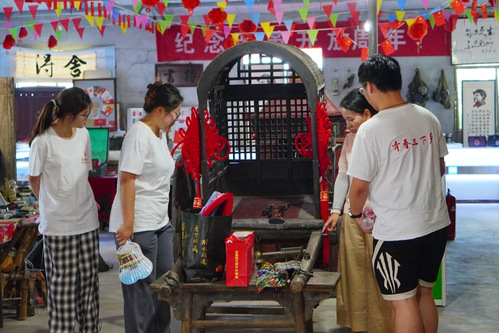 七月的热浪裹挟着田野绿意,实践团成员满怀热忱抵达高店乡江淮民俗博物馆。在馆长王世淮的引领下,志愿者们漫步于陈列着上世纪六七十年代农耕器具、劳动工具、生活用具的展厅——锈迹斑驳的犁铧、古朴旋转的纺车、泛黄蜷曲的票据、按键磨损的老式收音机…… 数千件展品如时光切片,完整保留着江淮地区农耕文明的肌理。