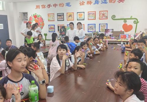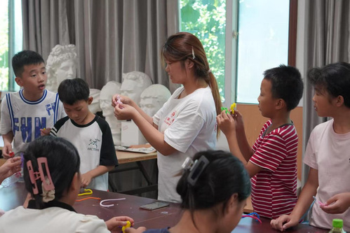 活动现场,志愿者小老师和孩子们围坐在一起。在制作扭扭棒作品时,小老师们手把手指导,从扭扭棒的弯折塑形到色彩搭配,一步步带领孩子学习与探索。孩子们手中的扭扭棒像被施了魔法,一只只灵动的花朵戒指、一朵朵别致的花朵手环渐渐成型。现场气氛热烈。专注的神情、尝试新造型时的兴奋,让课堂满是童真与活力,在乡村夏日绘出创意满满的画面。