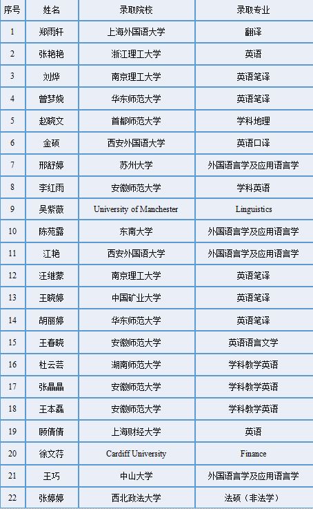 专业升学率高,人才培养成效显著。近年来,40 名毕业生考入西安外国语大学、上海外国语大学、中山大学、东南大学、苏州大学、安徽师范大学、安徽大学、合肥工业大学等高校的英语、翻译硕士、语言学、学科教学(英语)等专业深造;2名学生考入英国卡迪夫大学、英国曼彻斯特大学攻读研究生;1名校友就读于新西兰奥克兰大学的神经语言学专业博士学位。部分毕业生深造院校与专业见表2。