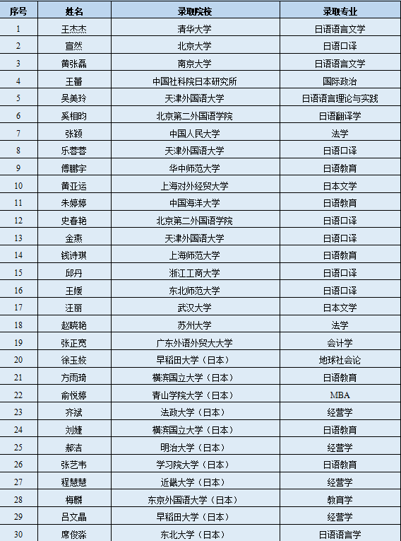 合肥学院毕业生就业率位居全省前列,是安徽省高校就业标兵单位,学生就就业创业和用人单位满意度高。日语专业历届毕业生常年保持96%以上的高就业率。目前,专业现有共计十六届总计400余名毕业生,为长三角地区输送了大批高素质应用型外语人才,毕业生社会赞誉度高,口碑良好。部分优秀毕业生见表1。