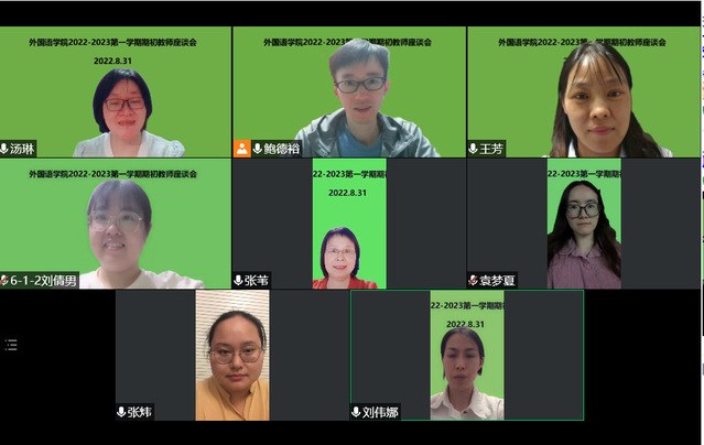 为保障新学期教学工作顺利运行及提高教学质量,根据学校期初教学检查要求,外国语学院831日举行期初教师座谈会。会议由我院督导组组长汤琳老师主持,英语系张苇、王芳,德语系张炜、刘倩男,东语系刘伟娜、袁梦夏六位老师参加。