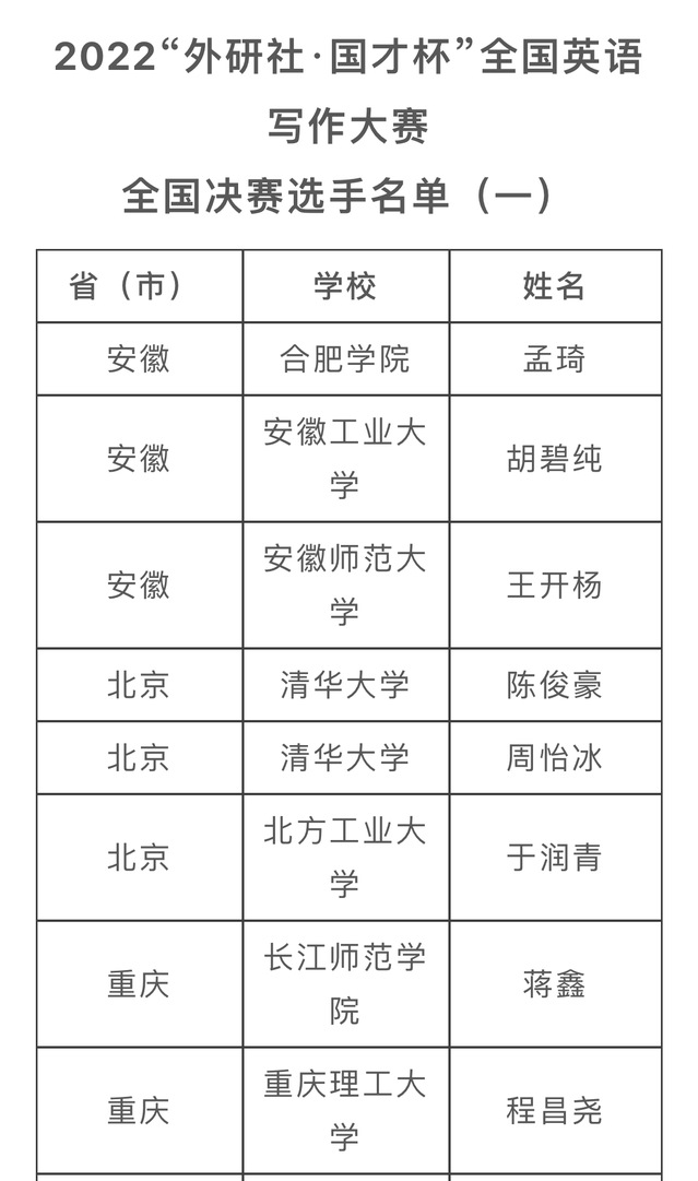 10月29日,2022“外研社·国才杯”全国英语演讲、写作、阅读大赛安徽省级决赛开启,外国语学院选派的孟琦、申笑慈同学在决赛中与来自全省各高校的选手同台竞技,稳定发挥,表现优异。孟琦同学分别参加了写作和阅读决赛,最终取得写作一等奖、阅读二等奖的好成绩;申笑慈同学获得演讲二等奖。孟琦同学以全省排名第一的成绩顺利晋级写作大赛全国决赛,这也是近年来我院在此项赛事上的一项重大突破。