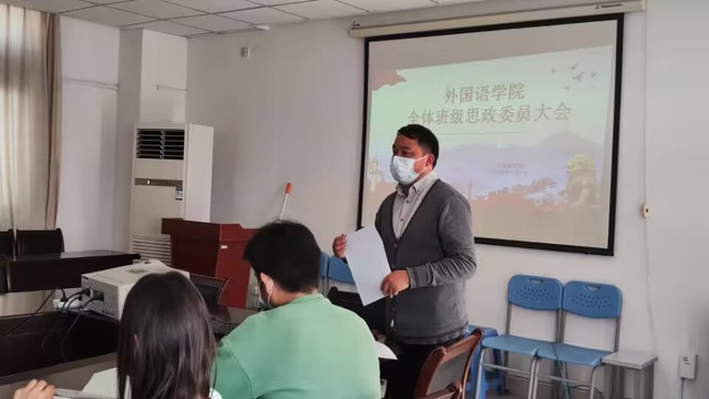 11月7日中午12点10分,外国语学院全体思政委员大会在8栋301顺利进行,院党委副书记吴孔宝亲临现场进行指导,学工办主任李发俊老师主持。