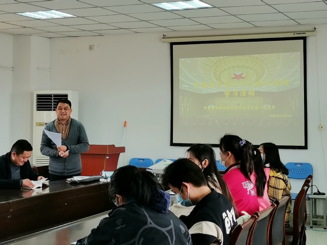 11月16日中午,中共外国语学院学生第一支部全体师生党员于外国语学院三楼会议室开展中国共产党二十大会议精神学习活动。学生第一支部书记李发俊老师带领全体党员学习