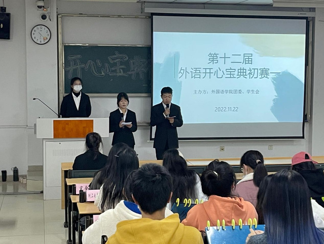 1122日晚六点四十五分,外国语学院第十二届“开心宝典”初赛第一场在一期五栋101顺利举办,共有八支队伍参加本次比赛。