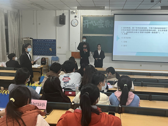 1124日晚上六点四十五分,由外国语学院团委组织的第十九届外语文化周第十二届“外语开心宝典”初赛第二场在一期五栋101顺利举办,共有八支队伍参加本次比赛。