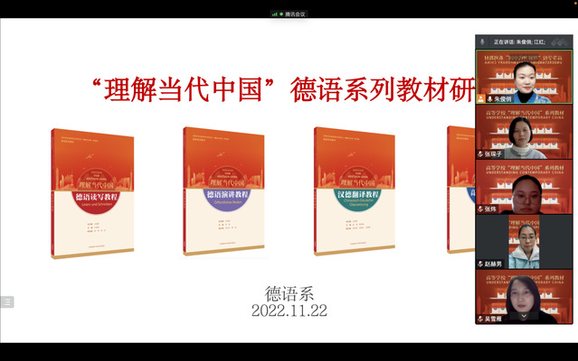 11月22日下午,德语系组织了关于《理解当代中国》德语系列教材的第二次线上研讨,对《德语演讲教程》《德语读写教程》和《汉德翻译教程》这三本教材以“先分组讨论、后集体汇报”的形式,进行了多轮次的理解和学习。老师们以教材目录和样章为抓手,结合所教授的课程和学生情况,设计了符合学情和教情的相关教案。《德语演讲教程》组老师认为这本教材可适用于中高年级语言课、演讲比赛备赛等教学环节,能够帮助学生在进一步、更全面理解中国的基础上,用所学德语讲好中国故事,提高学生的德语口语和演讲能力。《德语读写教程》组老师认为该教材适用于读写类及语言类课程,帮助学生在学习某一主题时,举出更生动、典型的中国案例,如当代青年人的使命与担当。《汉德翻译教程》组老师用一份简单的教案,展示了如何将时政文献的翻译和翻译策略的学习进行有机融合,以实现内容为载体,教授翻译策略。