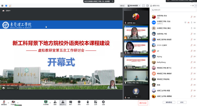 11月17日晚,英语系和东语系参加了由东莞理工学院主办的围绕“三进”工作和《理解当代中国》系列教材的虚拟教研室活动。广东外语外贸大学英语教育学院院长董金伟教授在主旨发言《大学英语课程思政的理论内涵与教学实施---以广东外语外贸大学为例》中,从课程思政的缘起,到为什么要课程思政,以及怎么做进行了深入探讨。广东医科大学外国语学院院长杨劲松教授在《课程思政理念下的英语零度课程设计---以医学人文英语为例》的发言中提出课程思政使外语教育的特征与本质过程的认识发生了颠覆性的变化。华南理工大学陈锦博士《课程思政视域下英语专业课堂评估的改革与实践》把课程自身作为一种文化形态。南昌工程学院梁良博士的《本科英语(翻译)专业“理解当代中国”系列英语读写教程学习重构行动及状况研究》对英语专业学生与翻译专业学生对于“理解当代中国”系列教程的学习动机进行了调查。东莞理工学院文学与传媒学院刘瑾老师《“英语演讲教程---思政元素融合际传播能力培养的教学设计》详细具体介绍了《英语演讲教程》课程思政设计思路以及在单元教学中具体设计过程。