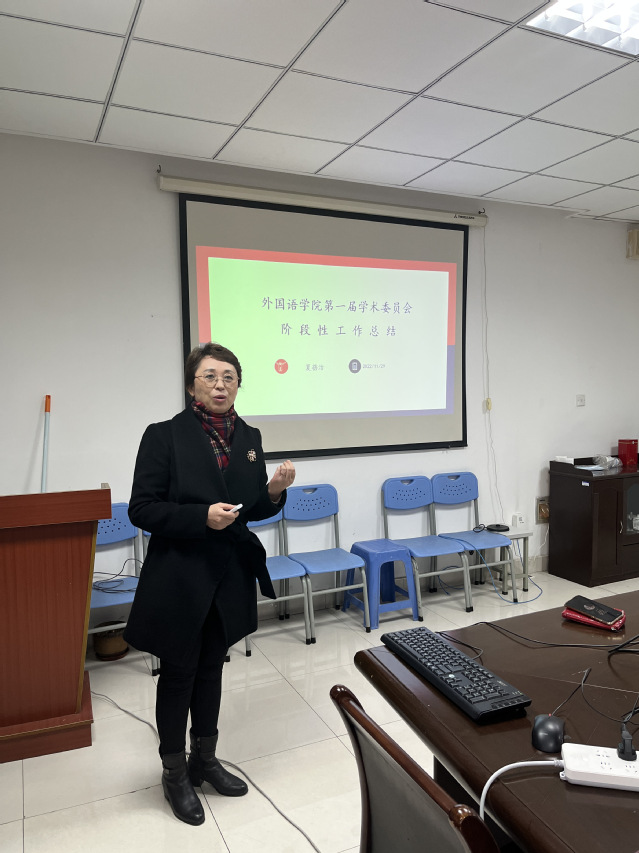外国语学院学术委员会主任夏蓓洁教授做了外国语学院第一届学术委员会阶段性工作总结。夏教授介绍了学术委员会的人员构成、宗旨和工作流程,重点梳理总结了学术委员会的八项常规工作,在肯定学术委员会成绩的同时也提出了下一步的工作方向。