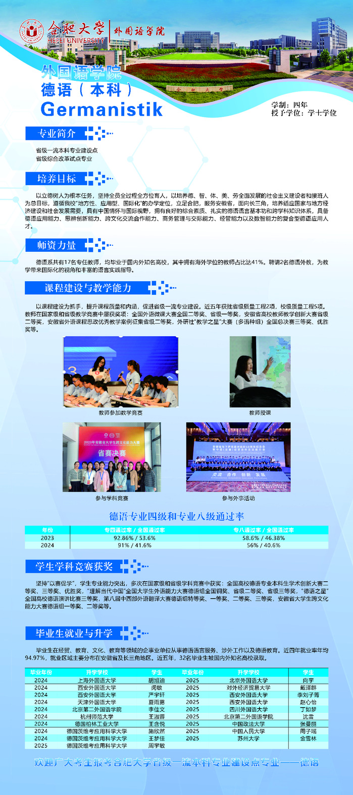 毕业生可在经贸、教育、外事、文化、教育等领域的企事业单位从事德语语言服务、涉外工作以及德语教育,在胜任目前岗位的基础上具备担任项目管理和成为业务骨干的能力,能根据工作岗位的需要获得相应的专业职称(翻译、外企行政及人事管理专员等),也可继续攻读硕士学位研究生或出国深造。
