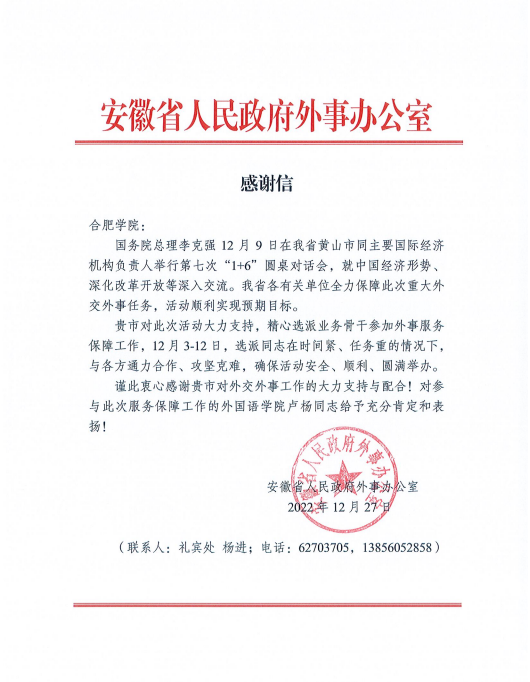 能参与国家重大外交外事活动服务保障工作,是我校全体师生的光荣。近日,安徽省人民政府外事办公室向我校发来感谢信,对参与此次服务保障工作的外国语学院卢杨同志给予充分肯定和表扬。(撰稿:王雨濛;审核:吴孔宝