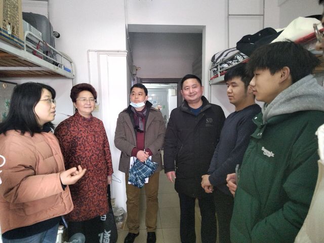 走访过程中,学院领导和辅导员们与返校学生亲切交流,仔细询问假期及到校后的状况,进一步就人身安全、财物安全等方面作了提醒。同时,他们还着重叮嘱同学们要注意防寒保暖,预防感冒发烧,要切实配合学校,做好常态化疫情防控工作,尽快调整生活状态,积极认真准备上学期因疫情延误的考试。最后,领导和老师希望学生们都能在新的学期做好学期规划,不断提升自我管理能力,以良好的精神面貌投入到新学期的学习生活之中。