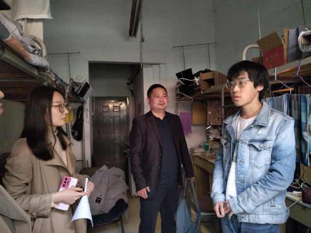 4月11日下午,外国语学院党委副书记吴孔宝、工办主任李发俊、团委副书记张正华、辅导员王雨濛一同走访了学生宿舍。
