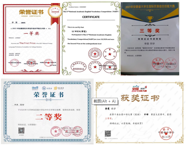 无论是在平常的学习与生活中,还是在考研道路上,李雯从来都不会轻言放弃。在大学期间,李雯收获了诸多荣誉,在自己专业的领域发光发热,2020年6月18日获得第五届全国大学生学术英语词汇大赛全国二等奖、2021年5月15日获得全国高校大学生外语水平能力大赛一等奖、2021年9月5号获得第十届全国口译大赛(英语)大区赛三等奖、2021年11月获得第五届”亿学 新东方“全国大学生英语词汇及综合能力大赛省一奖……面对强大的对手,李雯仍能保持沉静,赛出自己的风采。比赛不仅是对李雯个人能力的检验与磨练,更成为了她走向成功的阶梯,助力她连续四年获得校奖学金和优秀学生干部称号,并于2023年3月被评为安徽省优秀毕业生和合肥学院优秀毕业生。