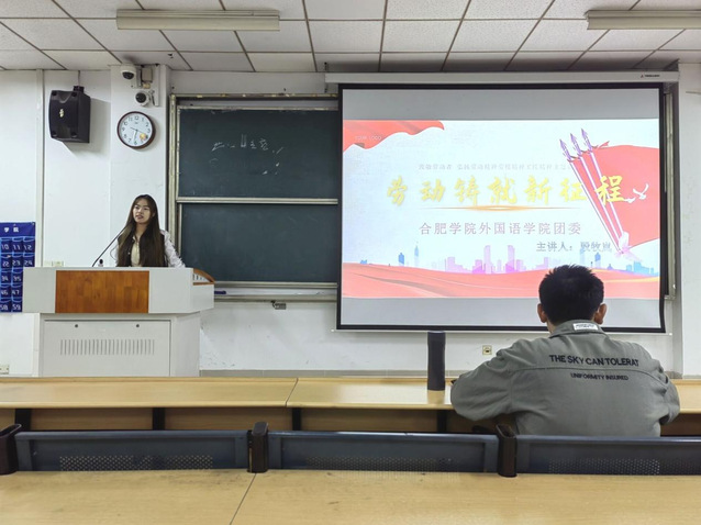 5月11日18时30分,由外国语学院团委主办的“劳动铸就新征程”主题宣讲活动于5栋101教室顺利开展。此次活动由院学生会主席团成员殷牧岚主讲,旨在增强同学们的劳动意识和劳动技能,帮助大家更好了解和认识劳动的价值。
