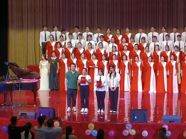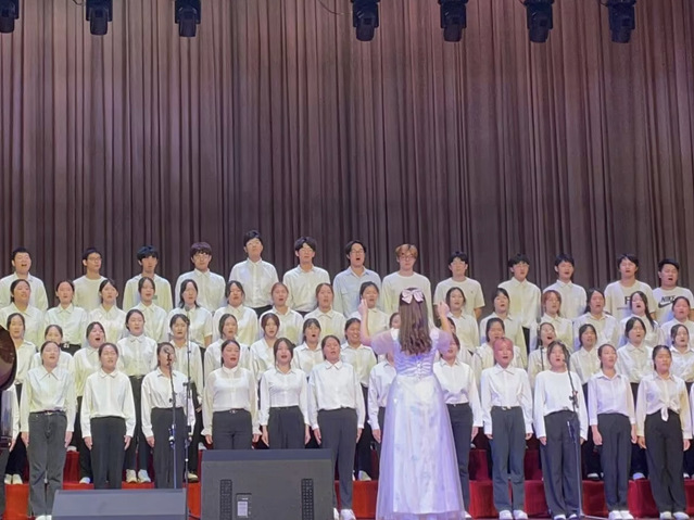 合唱比赛现场气氛热烈,座无虚席。在主持人简洁有力的串词引导下,外国语学院师生合唱队身着正装登场。我院学生首先唱响《没有共产党就没有新中国》,质朴的歌词、激昂的旋律和高亢的歌声唱出了新时代人民开启新征程、扬帆再出发的决心和信心。紧接着,他们演唱了一首鄂中南地区民歌《洪湖水浪打浪》,现场气氛推向高潮。最终,我院以90.9的成绩荣获一等奖。