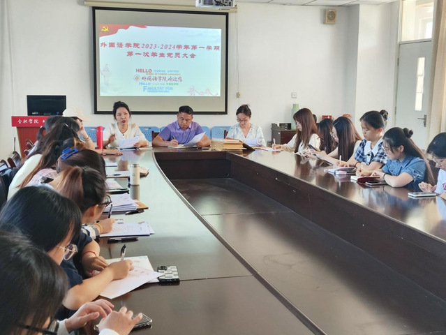 为促进基层党组织建设稳步提升,促增党员先锋模范作用有效发挥,9月1日中午十二点,外国语学院2023-2024学年第一学期第一次党员大会在8栋三楼会议室顺利进行,学生党支部书记李发俊、王雨濛和正科级组织员李菲菲出席会议,外国语学院全体学生党员参加会议。