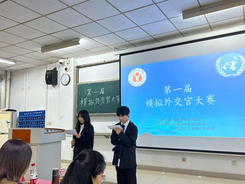 10月27日晚18:30,由外国语学院团委主办,科创部、文体部、外联部、外语之角联合承办第一届模拟外交官大赛初赛5-101教室顺利举行。本次比赛邀请到高乔楠、卢、冉志晗及李发俊四位老师担任评委,全校共计49组学生方阵参加了初赛。