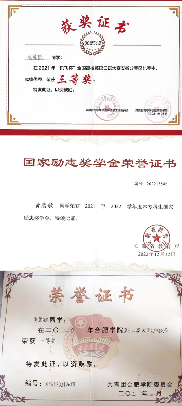 回首过往,黄慧敏用“充实”二字概括和总结了自己四年的大学生涯。进入大学之初,她不但积极调整自身的学习状态,而且乐于参加各种比赛和活动来提升自己的综合素质能力。“处理事情和参加比赛也让我得到了锻炼。比如让我学会如何处理人际关系,如何更有效地学习,如何处理好情绪……”千里之行,始于足下。任何成就的背后都有夜以继日的努力支撑着。黄慧敏对自己有着清晰的规划,通过合理分配每一天的时间,确保既能有良好的学习效果,又能有空余时间去参加感兴趣的活动。这四年里,她曾多次荣获“三好学生”称号,获得国家励志奖学金、校级奖学金、2020年合肥学院第十二届大学生科技节一等奖、2021“讯飞杯”全国高校英语口语大赛安徽分赛区三等奖。