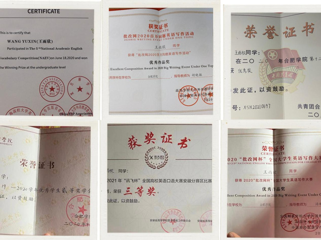 王雨欣在刚进入大学之初,无论是生活还是学习都处于一个懵懂的状态,大学带给她的感觉似乎是枯燥的,但是她没有让自己一直处于这个状态。她开始拓展自己的专业知识,培养广泛的学习兴趣,勤于钻研。丰富多彩的校园生活并没有让她放松自己的学习,她明白在培养自己多方面的能力和素质时,要时刻保持自己的学习状态。于是,她开始为自己计划日程安排,合理安排时间让自己既能很好的投入到工作中,同时还有足够的精神复习专业课。她勤奋学习、刻苦钻研、严于律己,通过自己的努力,获得了2019-2020学年优秀学生二等奖学金、第八届挑战杯安徽省大学生创业计划竞赛优秀奖,在专业课方面,王雨欣更是取得了优异的成绩,获得了2020“外研讯飞杯英文诵读大赛三等奖、百万同题英语写作优秀作品奖、安徽省第二届翻译(笔译)大赛英译汉优秀奖和五届全国学术英语词汇比赛优胜奖。