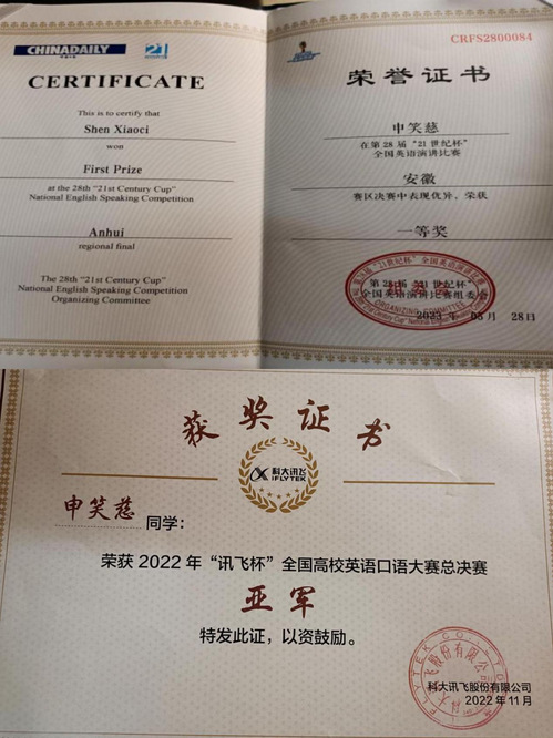 青春是石,敲出星星之火;梦想是火,点燃熄灭的灯;励志是灯,照亮夜行的路;勤奋是路,引你走向黎明。申笑慈同学不负韶华,大学期间不仅成绩优异,而且积极参加各种比赛,获“外研社·国才杯”英语演讲大赛全国铜奖、“外研社·国才杯”英语辩论赛”华东赛区三等奖、“讯飞杯”口语大赛全国亚军、第八届中西部翻译大赛口译全国一等奖、笔译全国二等奖、“21世纪杯全国演讲大赛”省级一等奖等诸多奖项。除了与专业相关的比赛之外,她还获得了“安徽省国际贸易技能大赛”省一等奖、“大学生讲思政课”校一等奖、“挑战杯”红色专项校三等奖等荣誉。申笑慈始终坚信“天道酬勤,全力以赴”,在校期间她也曾多次获得外国语学院特等奖学金、国元证券奖学金、罗顿奖学金以及优秀团员、优秀班干、三好学生等荣誉称号。