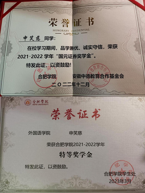 青春是石,敲出星星之火;梦想是火,点燃熄灭的灯;励志是灯,照亮夜行的路;勤奋是路,引你走向黎明。申笑慈同学不负韶华,大学期间不仅成绩优异,而且积极参加各种比赛,获“外研社·国才杯”英语演讲大赛全国铜奖、“外研社·国才杯”英语辩论赛”华东赛区三等奖、“讯飞杯”口语大赛全国亚军、第八届中西部翻译大赛口译全国一等奖、笔译全国二等奖、“21世纪杯全国演讲大赛”省级一等奖等诸多奖项。除了与专业相关的比赛之外,她还获得了“安徽省国际贸易技能大赛”省一等奖、“大学生讲思政课”校一等奖、“挑战杯”红色专项校三等奖等荣誉。申笑慈始终坚信“天道酬勤,全力以赴”,在校期间她也曾多次获得外国语学院特等奖学金、国元证券奖学金、罗顿奖学金以及优秀团员、优秀班干、三好学生等荣誉称号。