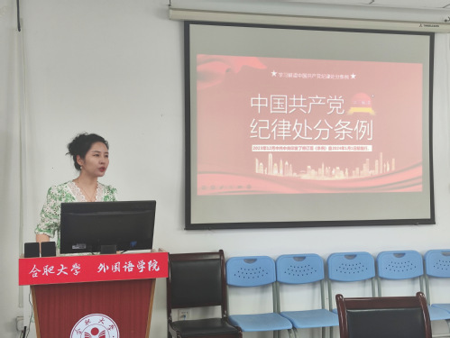根据学院党纪学习教育计划安排,6月12日,外国语学院学生第一党支部书记李菲菲,以“学习解读中国共产党纪律处分条例”为主题,支部全体党员上了一次专题党课。