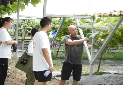 78日上午,三下乡团队成员在指导老师张正华的带领下先后走进美菊香家庭农场和合肥春盈农业科技有限公司,实地参观葡萄现代农业产业园。这里,南太湖特早阳光玫瑰等优质葡萄品种在阳光下熠熠生辉,每一颗都承载着果农的辛勤与汗水。你看这些葡萄都套着纸袋子,目的就是为了果子光亮,并且在打除草药的时候保证果子不接触到药物。王代美指着园子里的排列整齐的葡萄合不拢嘴我们家的葡萄采用大棚种植与喷灌技术,实现了葡萄的早熟与高产”马长安骄傲地说。