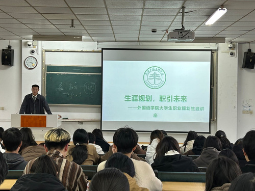 11月23日下午4时,外国语学院于一期5栋101教室举行了秋季学期企业高管进校园活动。此次活动特别邀请到安徽来盛日语培训学校的人事经理赵康为全体大一新生开展了职业生涯规划讲座。参加讲座的还有外国语学院张正华及王雨濛老师。
