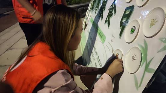 展板活动的现场以“粮食”为主题,参与者需要在纸盘上绘图或手写诗句,粘贴在展板上,完成这一系列后即可参与抽奖。路过的同学们踊跃参与本项活动,在纸盘上用心挑选彩笔的颜色勾勒粮食的简笔画,或是写下与粮食有关的诗句、标语。一幅幅作品,一笔笔勾勒,一句句标语都无一不凝聚着同学们对粮食的敬畏之情,仿佛在诉说着每一粒粮食背后的辛勤耕耘。