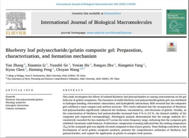 2025年2月,日韩欧美福利视频_黑人巨大人精品欧美三区_欧美成人另类人妖_欧美在线精品一区二区三区_欧美一区二区三区性视频_日韩精品欧美视频_性欧美极品xxxx欧美一区二区生物食品与环境学院王储炎教授课题组在International Journal of Biological Macromolecules(1区TOP,IF=7.7)发表了题为“Blueberry leaf polysaccharide/gelatin composite gel: Preparation, characterization, and formation mechanism”的论文。王储炎教授为通讯作者,硕士研究生张岩为第一作者。