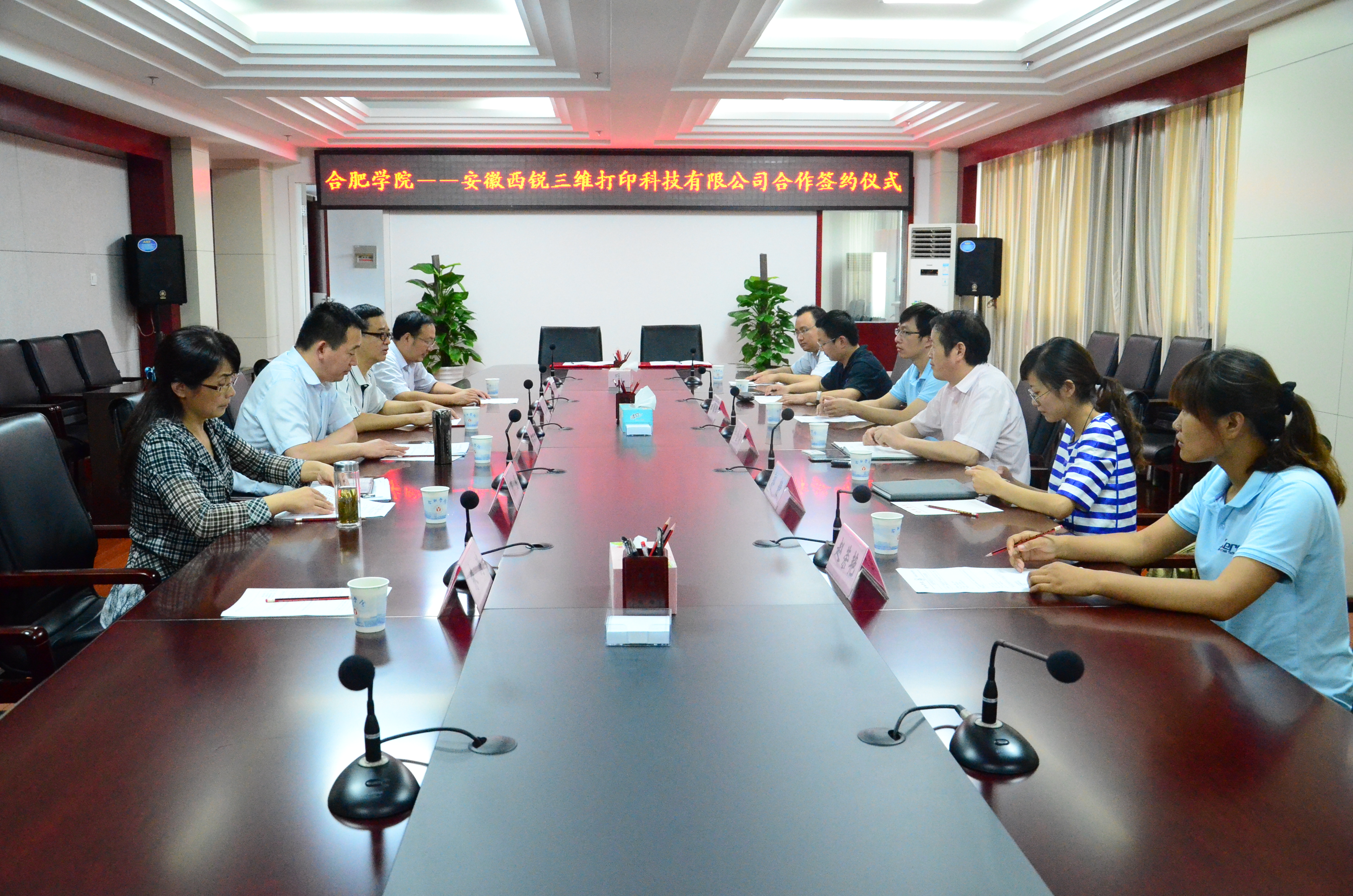 7月17日,我院与西锐三维打印科技有限公司合作签约仪式在行政楼9楼东会议室举行,安徽省政府发展研究中心李煜处长,西锐三维打印科技有限公司董事长余金湖、市场部总监郭静、技术部部长王春阳,我院院长张文兵,副院长丁明、陈秀共同出席了签约仪式。签约仪式由丁明主持。