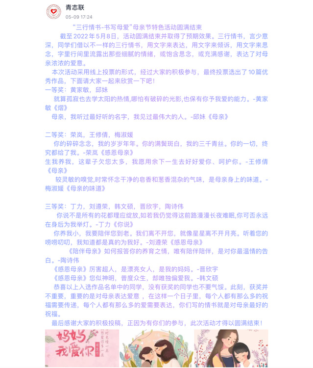 本次母亲节特色活动号召同学们用实际行动对自己的母亲献出最真挚的祝福,引导同学们表达感恩之心,增强了同学们的感恩意识。相信青年学子将以自己的方式感恩母亲,感恩祖国。