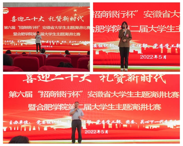 5月26日,合肥学院喜迎二十大、礼赞新时代”第二届大学生主题演讲比赛图书馆报告厅举行。比赛由党委组织部、党委宣传部、党委学工部、团委、关心下一代委员会联合举办。安徽省演讲学会会长崔跃松、招商银行云谷路支行行长胡婧、教育学院教授鲁世秀、党委学工部思政教育中心主任黄锐、校团委副书记李妍妍担任评委。