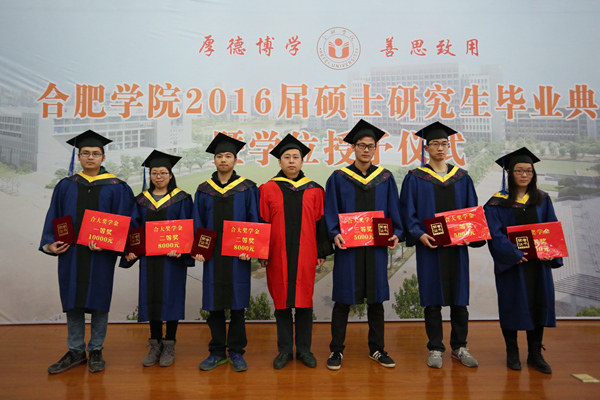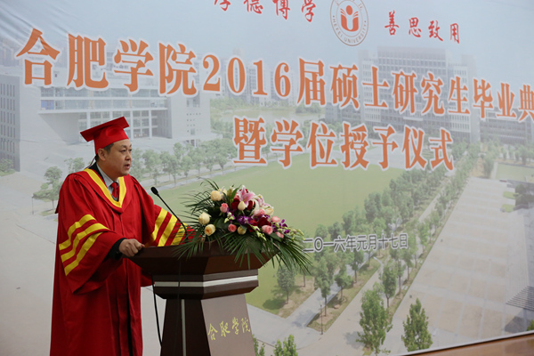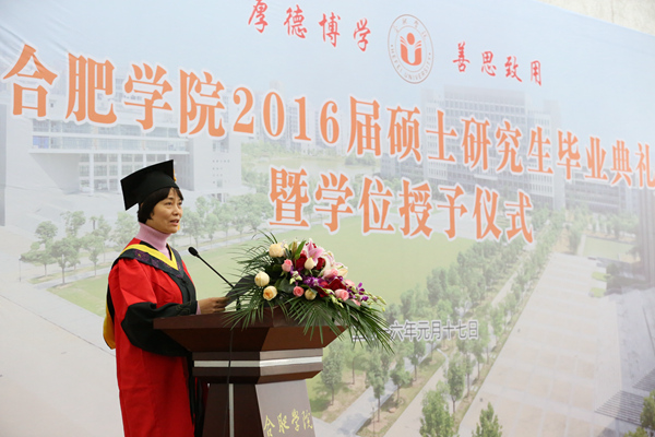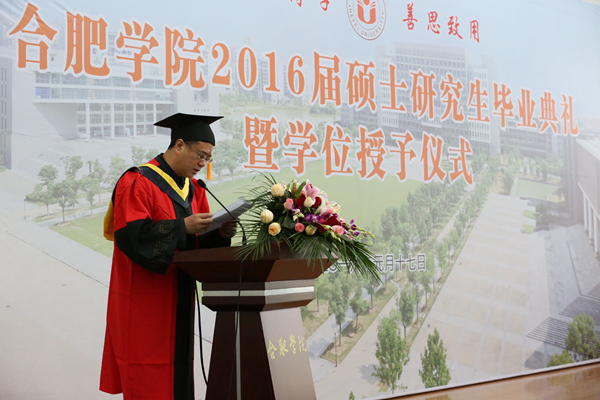 毕业典礼在庄严的国歌声中开始。合肥学院硕士研究生学位评定委员会委员、校党委副书记丁明教授首先宣读了合肥学院硕士研究生学位评定委员会“关于授予2016届环境工程专业徐芳丽等29名研究生工程硕士学位的决定”和 “关于表彰合肥学院2016届环境工程专业硕士研究生科研成果奖、优秀毕业生、优秀毕业论文和‘合大环保奖学金’获得者的决定”。