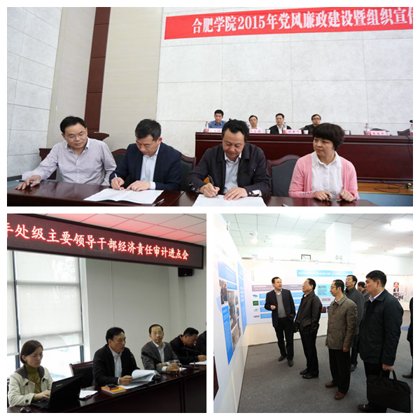 “十二五”期间,学校党委制定了《中共合肥学院委员会关于贯彻落实中共中央<建立健全惩治和预防腐败体系2013—2017年工作规划>的实施意见》。制定了《中共合肥学院委员会关于落实党风廉政建设党委主体责任和纪委监督责任的实施意见》。该方案明确了党委在党风廉政建设方面的6项责任,党委书记作为第一责任人的4项责任,纪委履行监督职责的6个重点任务,班子其他成员的4项责任,形成了“党委统一领导、党政齐抓共管、纪委组织协调、部门各负其责、群众支持参与”的领导体制和工作机制,党风廉政建设的“两个责任”得到很好的落实。每年,党委行政主要负责人分别与各系党总支书记、各系主任,院直各部门主要负责人签订了党风廉政建设责任书。责任书明确要求在基建(维修)工程、物资采购、招生考试、科研经费使用、招标投标、职称评审、评优评先、财务资金收支管理等方面要加强监管,特别要注重过程管理,对本部门的党风廉政建设切实负起领导责任,不断增强落实“两个责任”的思想自觉和行动自觉。