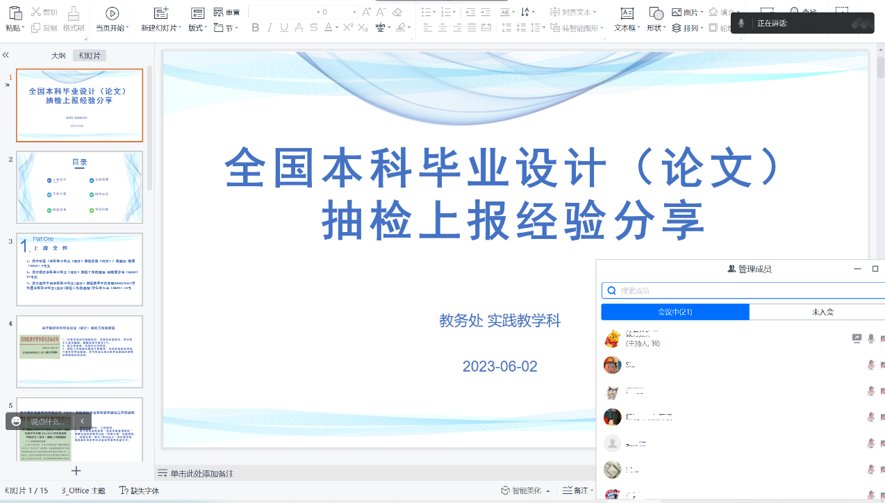 会上,教务处实践教学科针对学校毕业设计(论文)相关文件进行再学习,尤其是撰写规范要求;围绕审核评估中关于毕业设计(论文)的档案材料进行说明(选题来源与意义、内容质量、格式规范、过程指导、成绩评定);宣贯教育部抽检文件和通知,明确抽检系统上报要求;关于本年度毕业设计(论文)上传工作时间节点分布及重点事项做出说明。