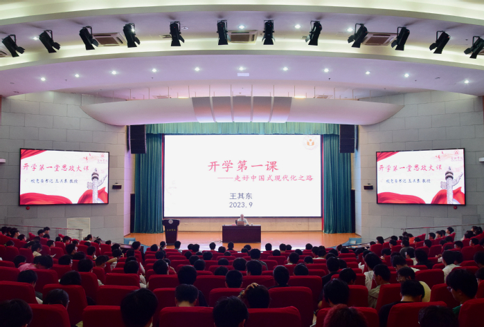 9月28日下午,党委书记王其东以“走好中国式现代化之路”为题在学术报告厅A厅为先进制造工程学院2023级新生和党员代表讲授“开学第一课”。先进制造工程学院学生党员代表和2023级全体新生到场聆听。
