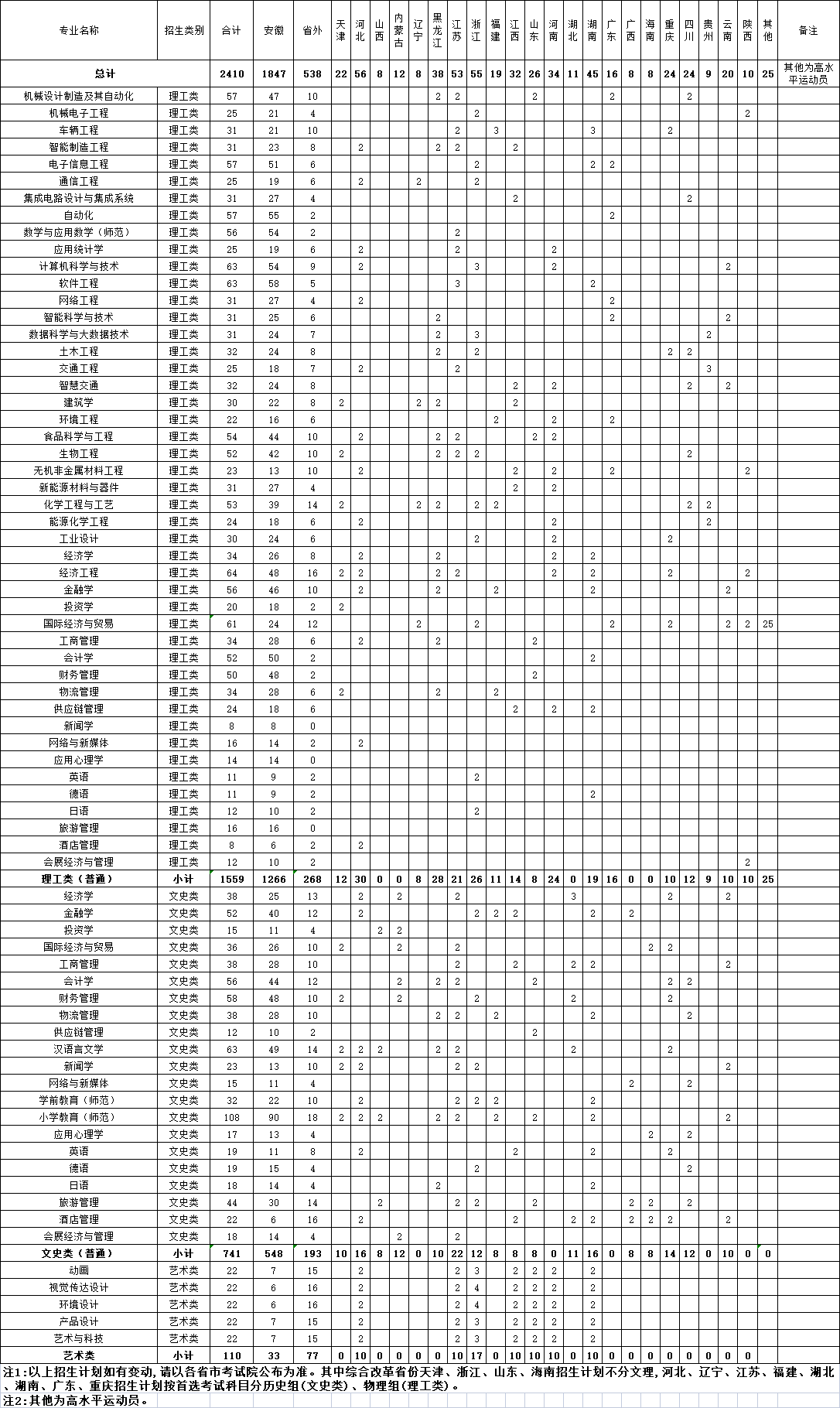 合肥学院2023年本科分省分专业计划安排表(不含专项计划、中外合作专业计划)(安徽省院校报考代码为9110)