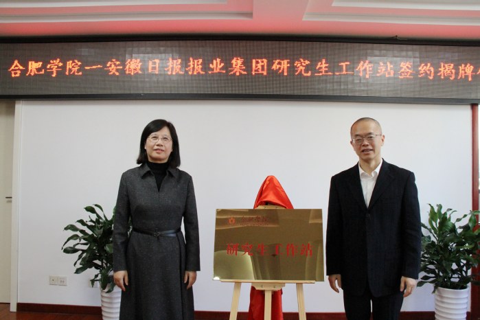 研究生处处长葛春梅与安徽日报报业集团人事处处长张擎分别代表合作双方签署共建研究生工作站框架协议,吴春梅与范荣晖共同为研究生工作站揭牌。