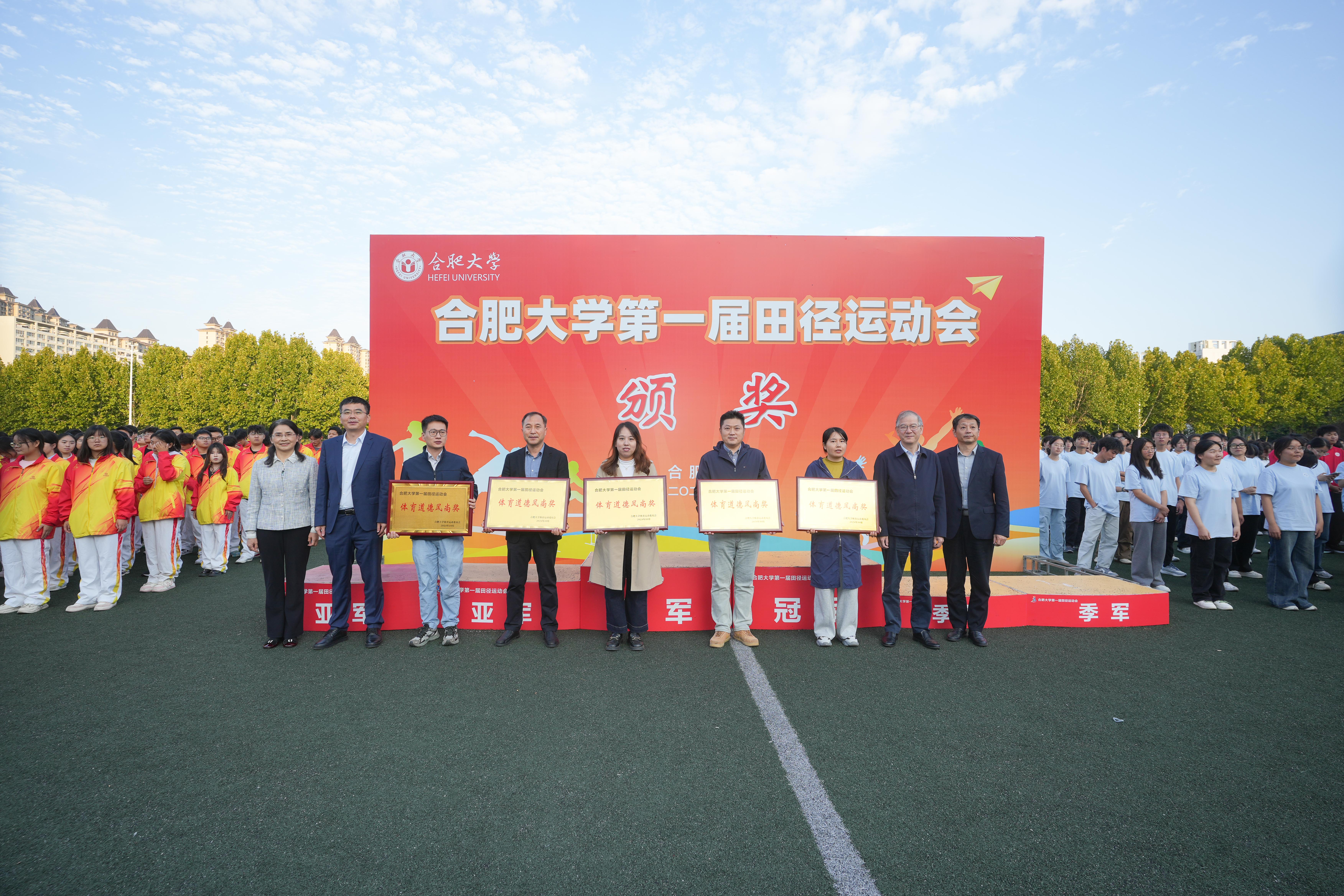 白义香宣读本次比赛结果:设计学院、教育学院、生物食品与环境学院、国际教育学院、大众学院荣获最佳组织奖;旅游与会展学院、经济与管理学院、语言文化与传媒学院、研究生代表队、外国语学院荣获体育道德风尚奖;先进制造工程学院代表荣获团体奖第一名;经济与管理学院、人工智能与大数据学院、设计学院荣获团体奖第二名;能源材料与化工学院、教育学院、研究生代表队、城市建设与交通学院荣获团体奖第三名。校领导为获奖单位颁奖。