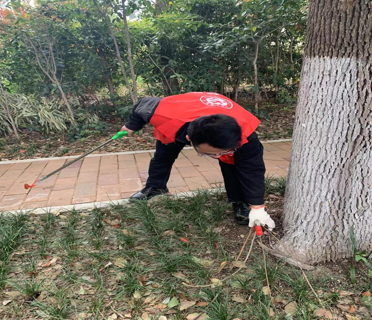 ▲合肥学院志愿者清理乡村花园小区草坪垃圾